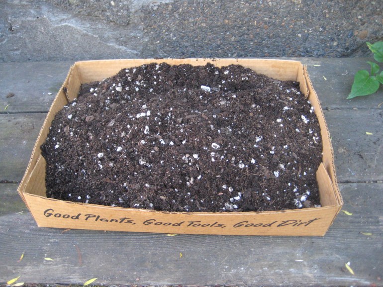 Put some rocks in the bottom to help with drainage, then add potting soil or just plain dirt. If you wish, you can put moss or wood chips on top. You can buy any or all of these materials at a garden store.